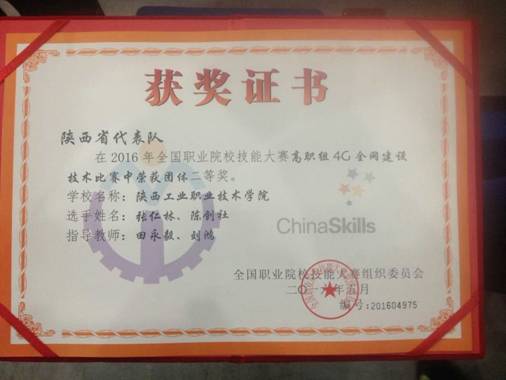 5月19日至21日,2016年全国职业院校技能大赛“4G全网建设技术”赛项比赛在南京信息职业技术学院举行。由我院电气工程学院田永毅和刘鸿两位老师指导通信技术专业1401班学生陈创社、张仁林组成的参赛队代表陕西省参赛。电气工程学院高度重视,院长段峻亲自带队,指导教师认真负责,参赛学生刻苦训练、精心准备,在比赛中勇于创新,克服重重困难,他们凭借扎实的训练和顽强的意志,经过四个小时的激烈竞赛,完成了竞赛要求的各项题目要求,在首次参加该赛项的情况下,取得了“4G全网建设技术”赛项二等奖的优异成绩。