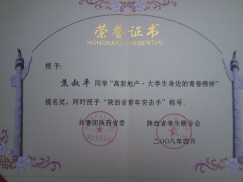 焦叔平,男,27岁,电气工程学院应用电子技术专业0501班毕业,现在西安西电高压开关有限公司工作。在2007年9月举行的全国电子设计大赛中,获得陕西省一等奖、全国二等奖的好成绩,为学院争得了荣誉。在校期间获得院级优秀学生、优秀团员、三好学生标兵等奖励。2008年4月被共青团陕西省委,陕西省学生联合会授予“大学生身边的青春榜样”和“陕西省青年突击手”光荣称号。